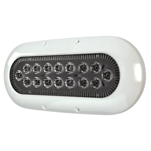 The OceanLED X‑Series X16 combines exceptional brightness with durability and ease of installation. With a slim surface‑mount design requiring only a 12.5 mm hole and four screws, it fits almost any hull. Its custom underwater optics produce a 60° circular beam for excellent water penetration, illuminating a wide area. Built from chemically‑resistant Grilamid polymer, with a built‑in driver and premium materials, it carries an IP69K certification for water ingress protection—one of the highest in the industry. Typical versions output up to 4,500 fixture lumens (approx. 5,800 raw lumens) and support 9–32 V DC systems (12 V or 24 V boats). Available in single colours (Ultra White or Midnight Blue) or full‑colour RGBW versions (colours models compatible with DMX / smartphone app). Additional features include “Fish‑Strobe” mode (randomised strobe lighting to attract bait fish), Tritonium‑coated lens for minimal marine growth, and Active Thermal Control (ATC) to protect the LEDs in harsh environments. Ideal for boats up to ~30 ft (9 m) in standard use, the X16 is also suitable for above‑water mounting (deck, cockpit, trailer) thanks to its versatile design.